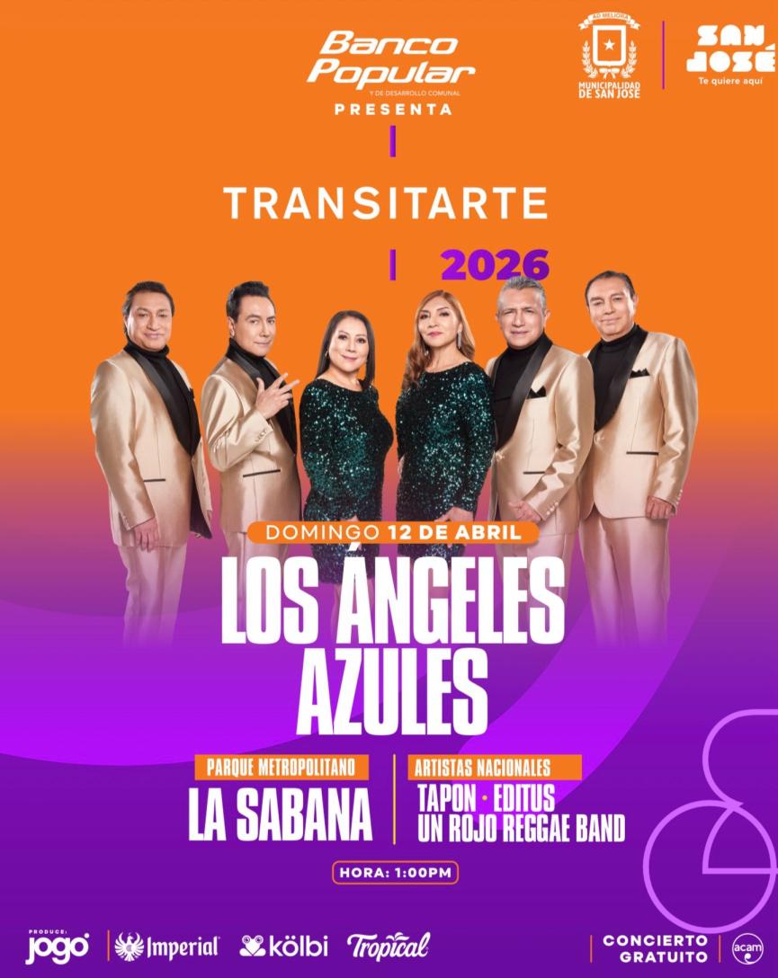 La Municipalidad de San José anuncia que la reconocida agrupación mexicana Los Ángeles Azules será la encargada de poner el broche de oro al Transitarte 2026 con un concierto gratuito el próximo domingo 12 de abril a las 7:20 p.m. en Parque Metropolitano La Sabana.
