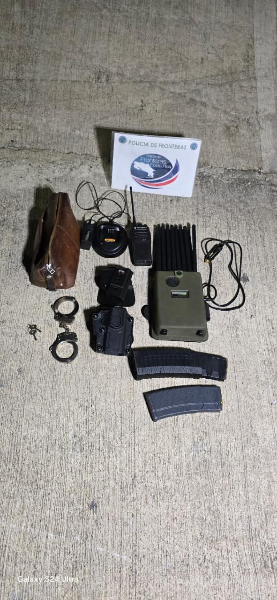 Además, fueron ubicados chalecos antibalas con insignias del OIJ, un inhibidor de señal, esposas, logos policiales y pasamontañas, entre otros artículos