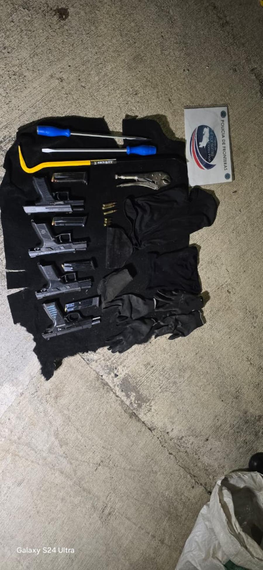 La noche de ayer miércoles, como parte de los controles que mantiene la Policía de Fronteras en el puesto policial del kilómetro 35 en Guaycará de Golfito, zona sur del país, se intervino un vehículo en el cual los oficiales descubrieron, gracias a su experticia y con la ayuda de un agente canino, un compartimiento oculto en el que fue hallado un importante arsenal que fue decomisado por la policía.