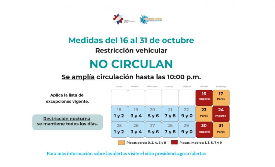 Del sábado 16 y hasta el 31 de octubre, se disminuirá la restricción nocturna de 5:00 a.m. a 10:00 p.m. de lunes a domingo en todo el país. No podrán circular las siguientes placas, salvo la lista de excepciones: