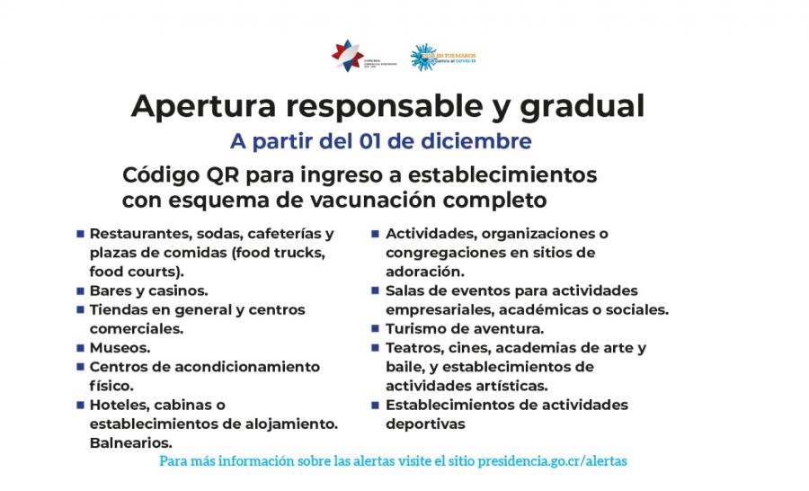 A partir de diciembre el ingreso a establecimientos como restaurantes, bares, tiendas, gimnasios, hoteles, entre otros, será para personas con esquema de vacunación completo; su verificación se efectuará a través de un código QR de vacunación.