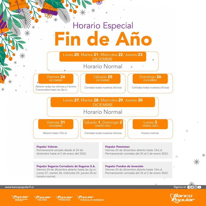 - El día viernes 24 de diciembre Popular Pensiones y Popular Fondos de Inversión (SAFI) atenderán hasta el mediodía; Popular Seguros atenderá hasta las 3 p.m. y Popular Valores permanecerá cerrada.