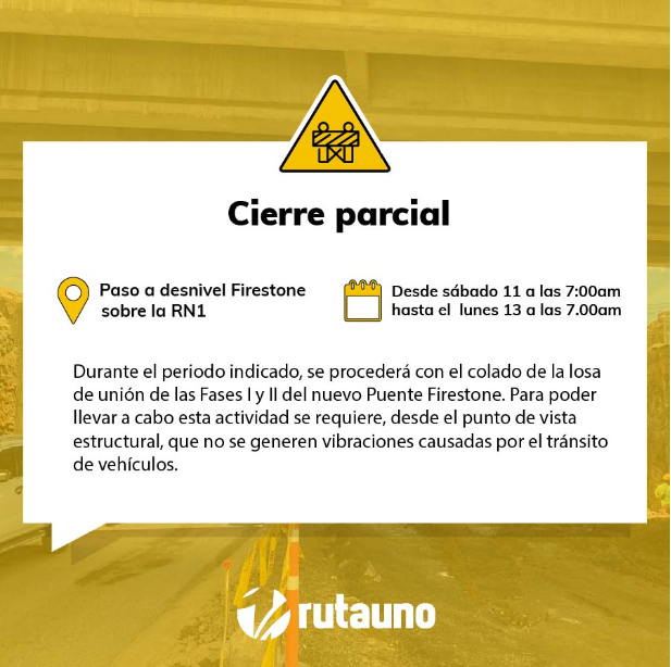 En el período comprendido desde el día sábado 11 de diciembre a las 7:00am y hasta el domingo 12 de diciembre a las 7:00am, se procederá con el cierre parcial de vías al tránsito vehicular sobre la RN1 a la altura del puente Firestone. Durante dicho período, se mantendrá la circulación de vehículos a un solo carril en el sentido San José – Alajuela. El tránsito que circula en el sentido Alajuela – San José se desviará en la salida de INTEL hacia el semáforo, antes de la llegada al puente Firestone, ahí podrá virar a la izquierda hacia la fábrica Firestone donde tomará a la derecha la Calle Arbolito para reincorporar a la RN1 hacia San José.