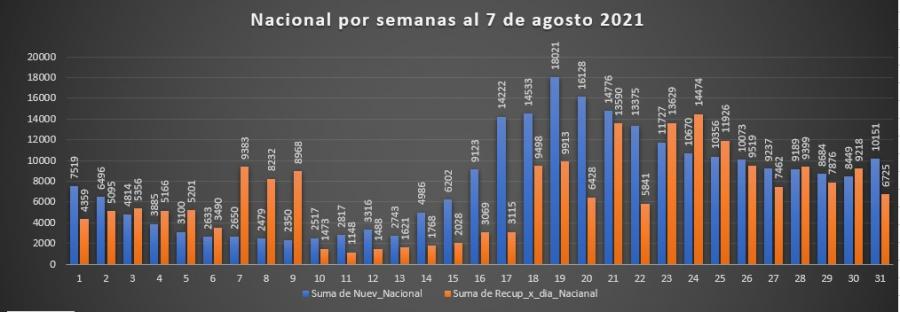 El resumen para esta semana a nivel nacional, en el caso de recuperados (6725) que suman menos que los nuevos contagiados (10151), marcando este último un aumento respecto a la semana anterior de (1702) por lo que ahora se muestra un incremento importante nuevamente.