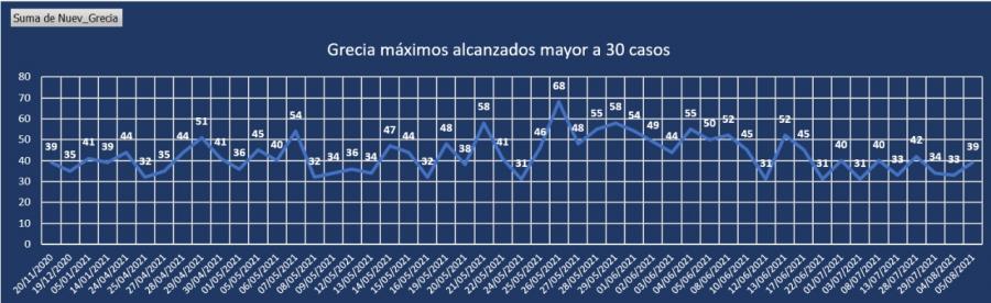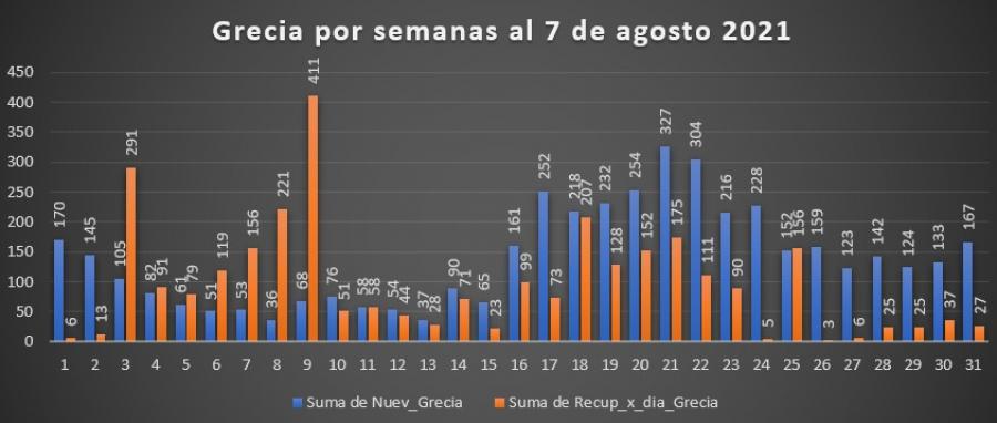 En resumen, tanto a nivel nacional como en Grecia del estancamiento entre subir y bajar pocos casos, vemos nuevamente que se incrementan los casos lo cual se percibe a pesar de la buena cantidad de vacunación a nivel nacional. Pareciera que la variable empieza a generar mas presión sobre todo el sistema sanitario mostrando nuevos internamientos y uso de UCIS.
