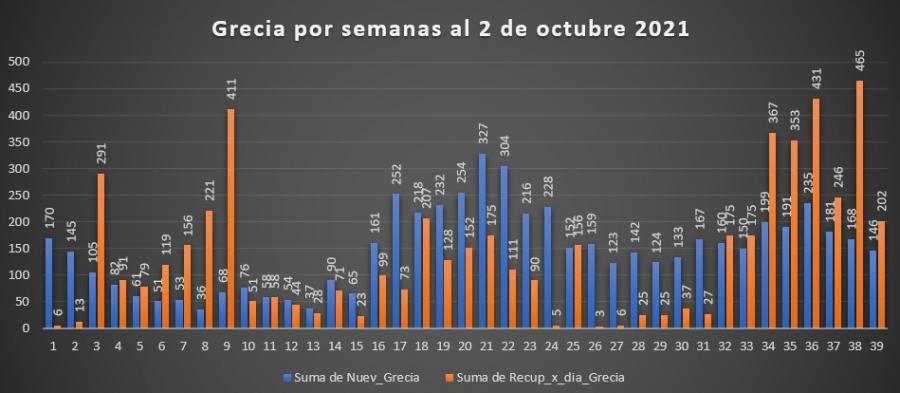 Nos encontramos que la semana recién terminada marca una disminución importante a nivel Nacional, así como en Grecia, a pesar de que la tasa de contagió se informó que había aumentado la semana anterior, pero con datos acumulados a semanas anteriores. Pareciera verse un poco el efecto de la vacunación, pero creemos que todavía falta lograr por lo menos una línea recta en casos pero con menos promedios que los actuales.