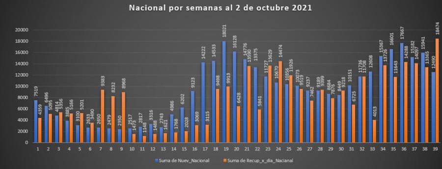 Para esta semana, nos encontramos que los casos nuevos por día a nivel nacional son 1784 en promedio y la semana anterior de 2277, mostrando nuevamente una disminución de 493 casos, y un promedio de recuperados de aproximadamente 2639 diarios, con un aumento en este último renglón.