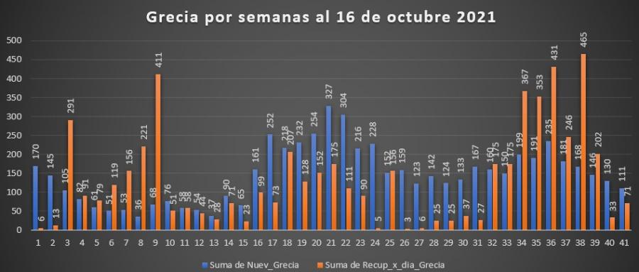 La disminución de los casos ha sido tan importante que tanto a nivel nacional como de Grecia, tienen un comportamiento similar en la información de esta semana con los registros de la semana 16 allá por el mes de abril. Adicionalmente Grecia por quinta semana consecutiva disminuye la cantidad de casos y a nivel nacional ya por tercera semana, lo que nos hace pensar que la vacunación empieza a tener mas efecto en la población.