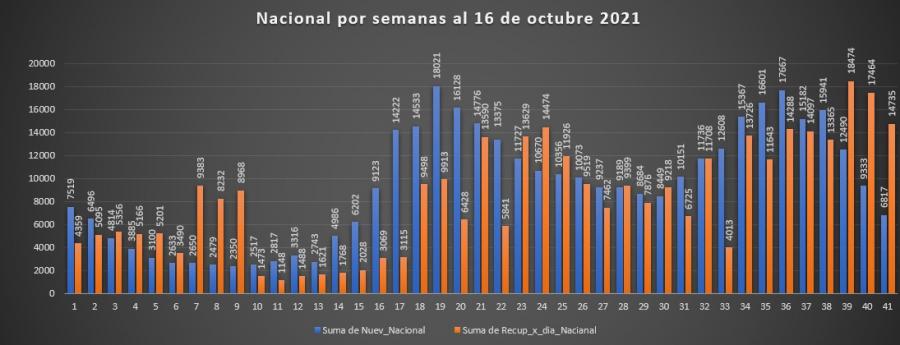 El resumen para esta semana a nivel nacional, en el caso de recuperados (14735) que suman más que los nuevos contagiados (6817), marcando este una merma respecto a la semana anterior de (2516) casos, por lo que se muestra una disminución importante.