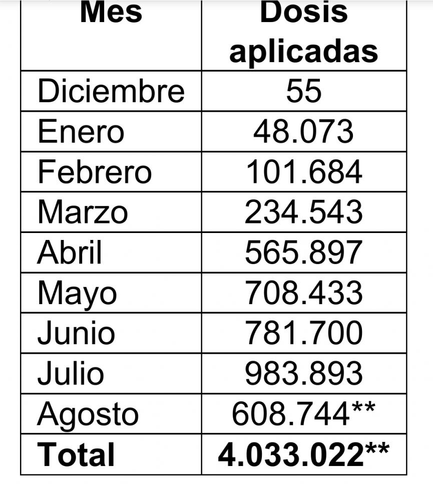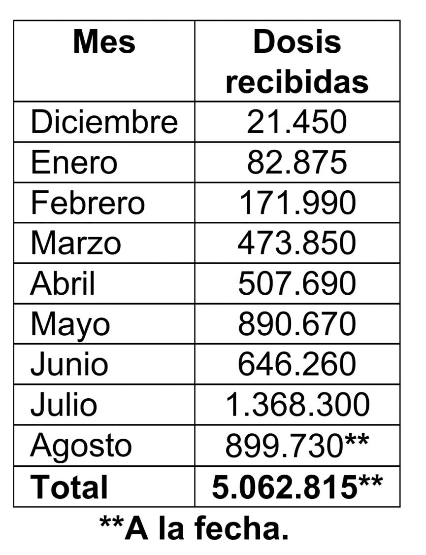 Durante lo que va de agosto, se han recibido 899.730 dosis, convirtiéndolo en el segundo mes con mayor ingreso de vacunas, y el primero por envíos de contratos de compra. Ver cuadro detalle.