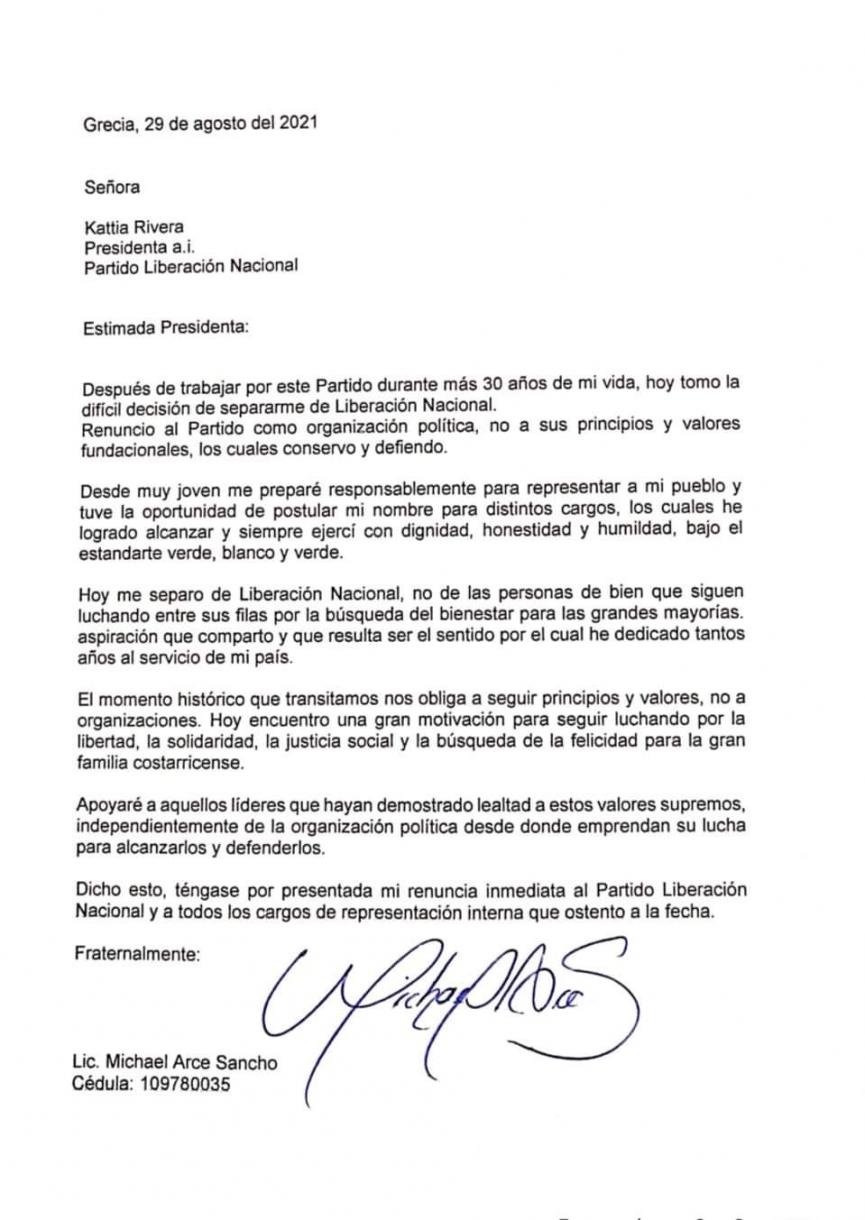 Mediante un oficio del 29 de agosto, le informa a Kattia Rivera, presidenta a.i del PLN, sobre su determinación de dejar el partido y cualquier puesto interno que ostente.