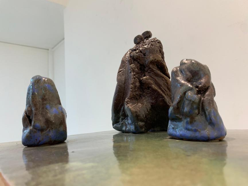 La exposición está compuesta de 18 obras; algunas utilizan arcillas volcánicas y distintas técnicas de horneado, para generar colores y acabados que, según la artista, tienden hacia lo pictórico, sin dejar de lado la técnica propia de la cerámica.
