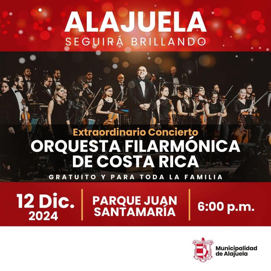 La Municipalidad de Alajuela continúa trabajando para ofrecer a los alajuelenses y ciudadanía en general una noche mágica e inolvidable junto a la Orquesta Filarmónica de Costa Rica, este jueves 12 de diciembre a las 6:00 p.m. en el Parque Juan Santamaría.
