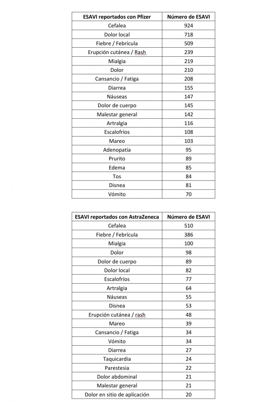 El Centro Nacional de Farmacovigilancia al 30 de julio de 2021 analizó un total de 5.015 notificaciones de ESAVI con la vacuna de Pfizer y 2.133 notificaciones de ESAVI con AstraZeneca. Dentro de las reacciones más reportadas con la vacuna de Pfizer se encuentran los trastornos del sistema nervioso (mayoritariamente la cefalea), seguidos de trastornos en el punto de aplicación (dolor local), de trastornos generales (fiebre/febrícula) así como trastornos de la piel (erupción cutánea / rash). Para la vacuna de AstraZeneca la cefalea también es la reacción más frecuente que se presenta, seguida de fiebre o febrícula, trastornos del sistema músculo esquelético (mialgias) y trastorno general (dolor).